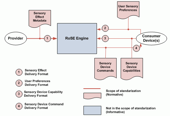 В рамках стандарта, разрабатываемого сейчас в MPEG, планируется стандартизировать метаданные для различных эффектов (например, в едином формате XML), структурировать функции сенсоров, определиться со способом передачи команд и пользовательских настроек (HTTP, UPnP?). Уже сейчас разработчикам есть от чего оттолкнуться, ибо чуть ранее уже были приняты два профильных документа: ISO/IEC JTC1/SC29/WG11/N9897 (Framework for Representation of Sensory Effects Information - Contexts and Objectives. 84th MPEG Meeting, April/May, Archamps, France), и ISO/IEC JTC1/SC29/WG11/N9427 (Call for Requirements on Framework for Representation of Sensory Effects Information. 82nd MPEG Meeting, Oct. 2007, Shenzhen, China). За рамками стандарта останутся остальные элементы системы, в том числе, RoSE Engine, предполагается, что их разработка будет выполнена наиболее интересным образом в процессе конкурентной борьбы различных коллективов.